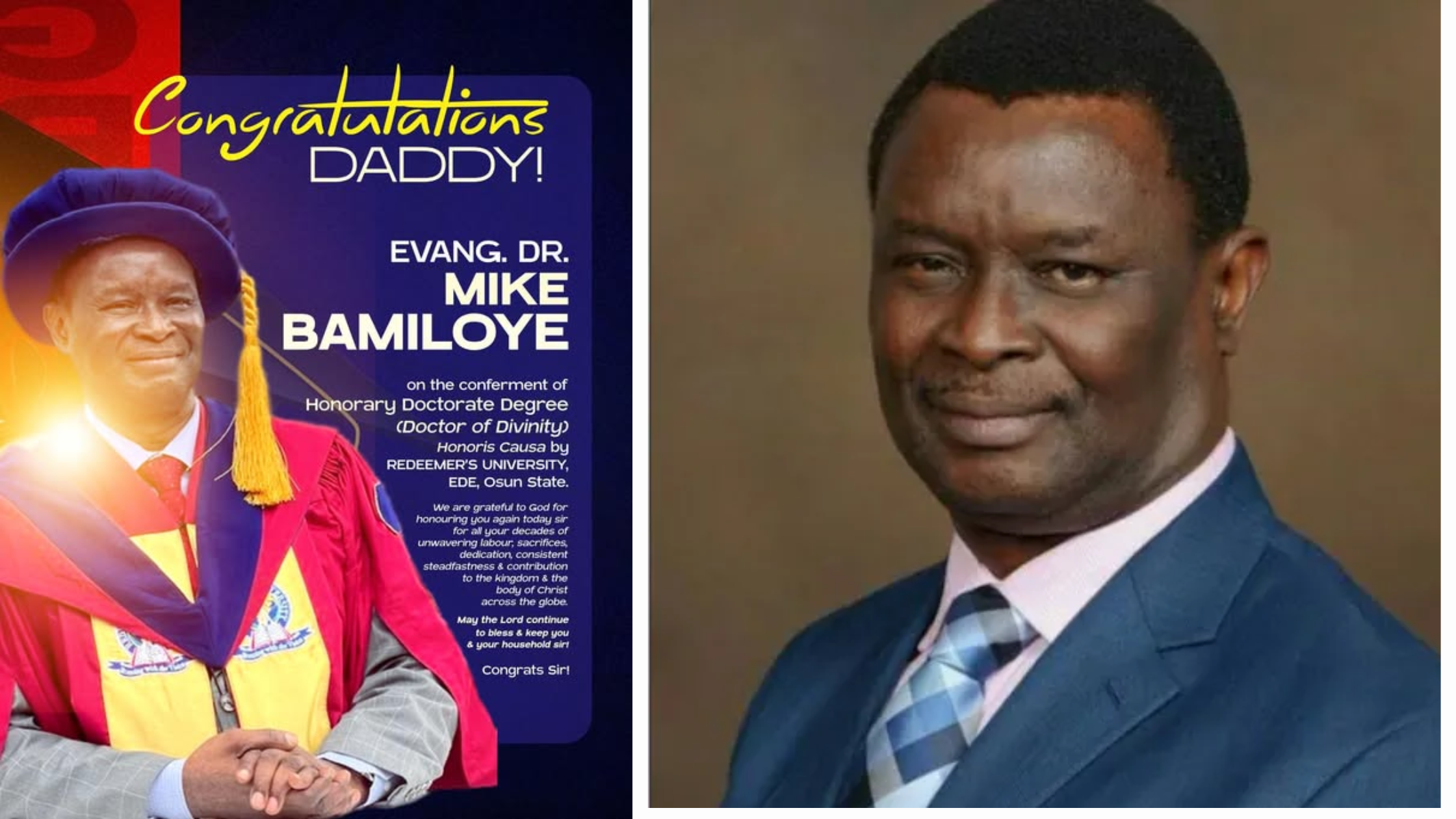 In a remarkable recognition of decades of impactful service in Christian drama and evangelism, renowned Evangelist, Mike Bamiloye, founder and president of Mount Zion Faith Ministries International, has been conferred with an Honorary Doctorate Degree (Doctor of Divinity – Honoris Causa) by Redeemer’s University, Ede, Osun State, Nigeria.